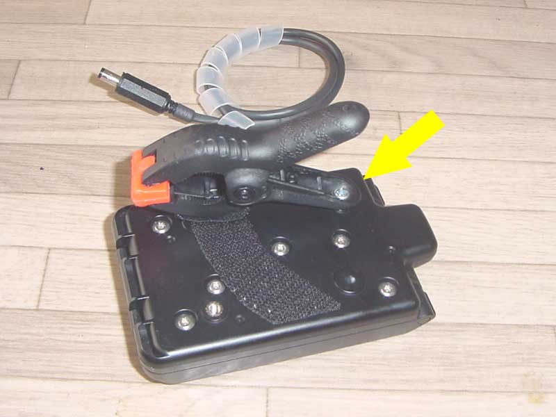 でも固定がイマイチ、矢印のネジ1本止めです。それだけじゃ怖いのでマジックテープで補強、クリップの角度を帰られるように円弧状に貼っています